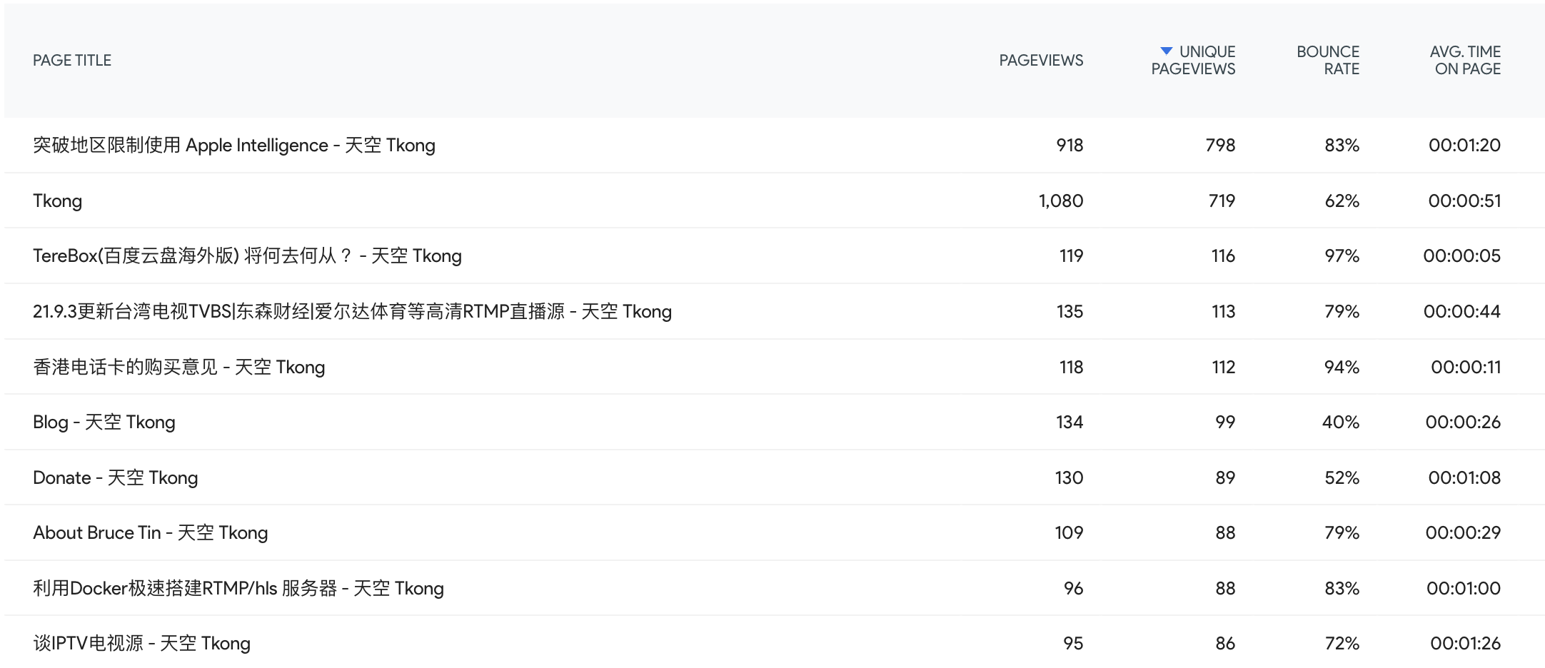 虽然我想分享一些数据,但其中有些情况让我感到失落和遗憾。今年 Tkong 访问量最大的文章是最近发布的《突破地区限制使用 Apple Intelligence》。透过数据分析,我们发现大部分访问来自搜索引擎,而这些访问者大多关注我们根据实时热点编写的文章。这一发现进一步确认了热点内容在吸引读者方面的重要性,也为我们未来的内容方向提供了有价值的参考。
