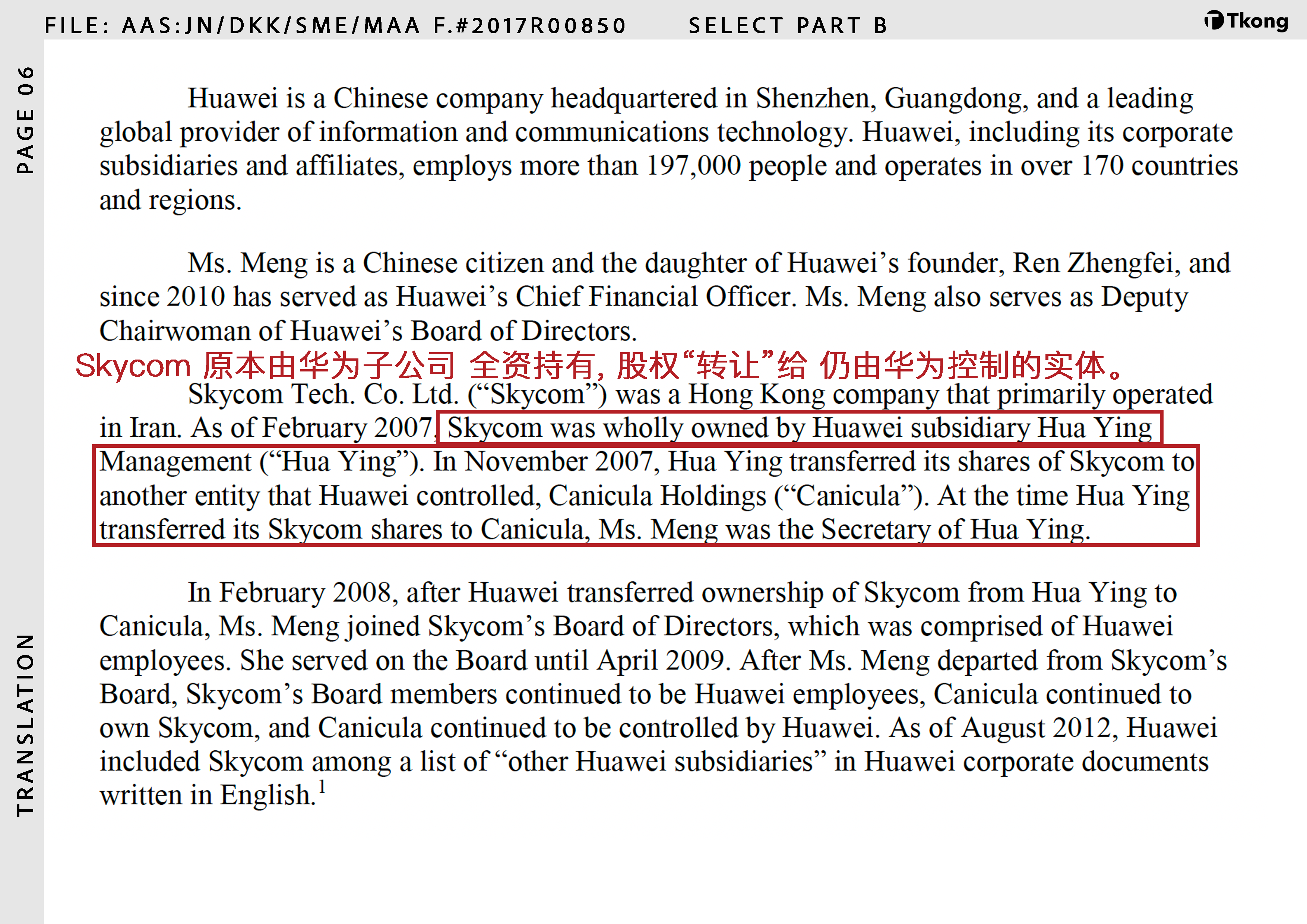 事实是什么(蓝色真相): Skycom 受华为控制;所谓的「出售股份」,实为从一个华为控制实体转移至另一个华为控制实体。