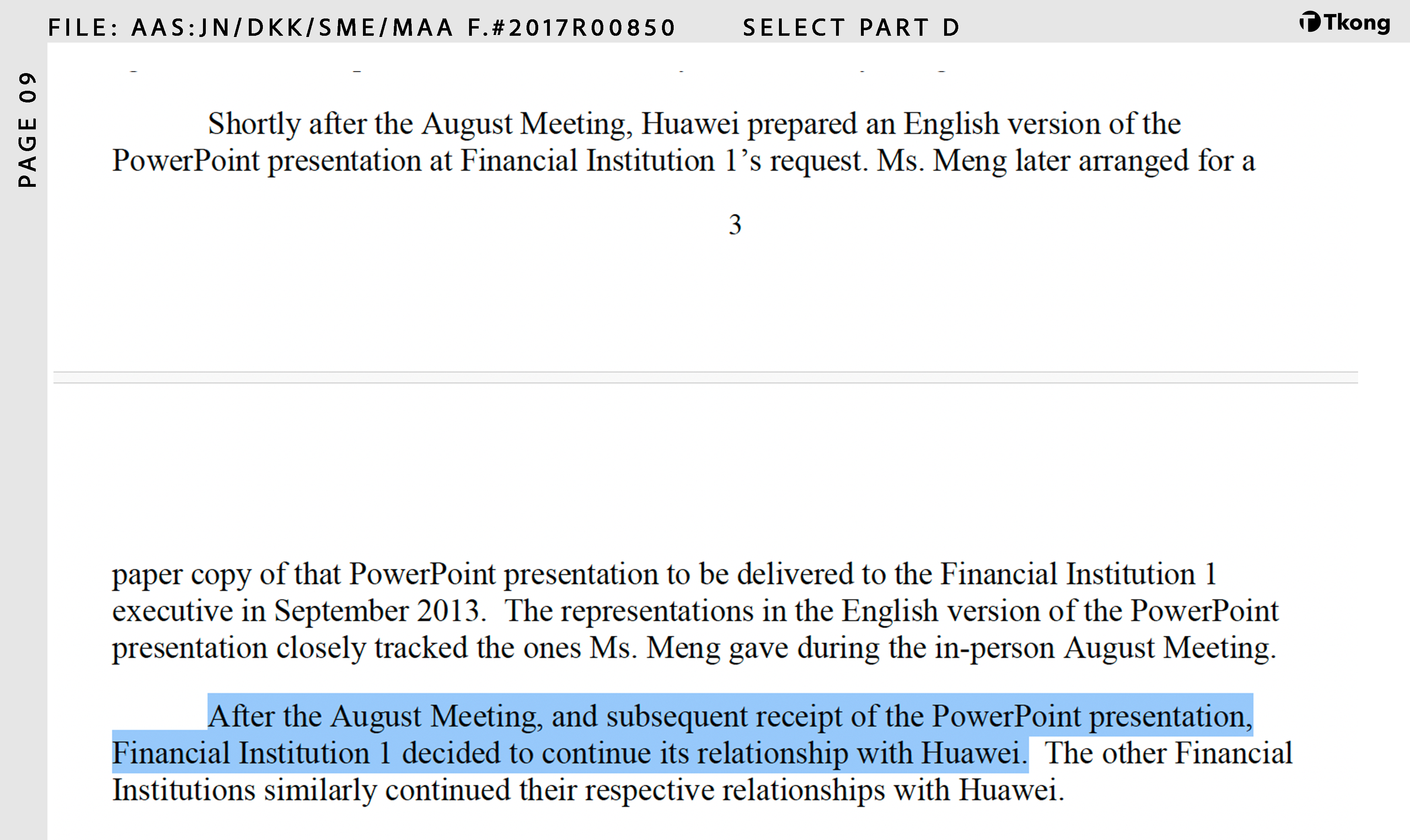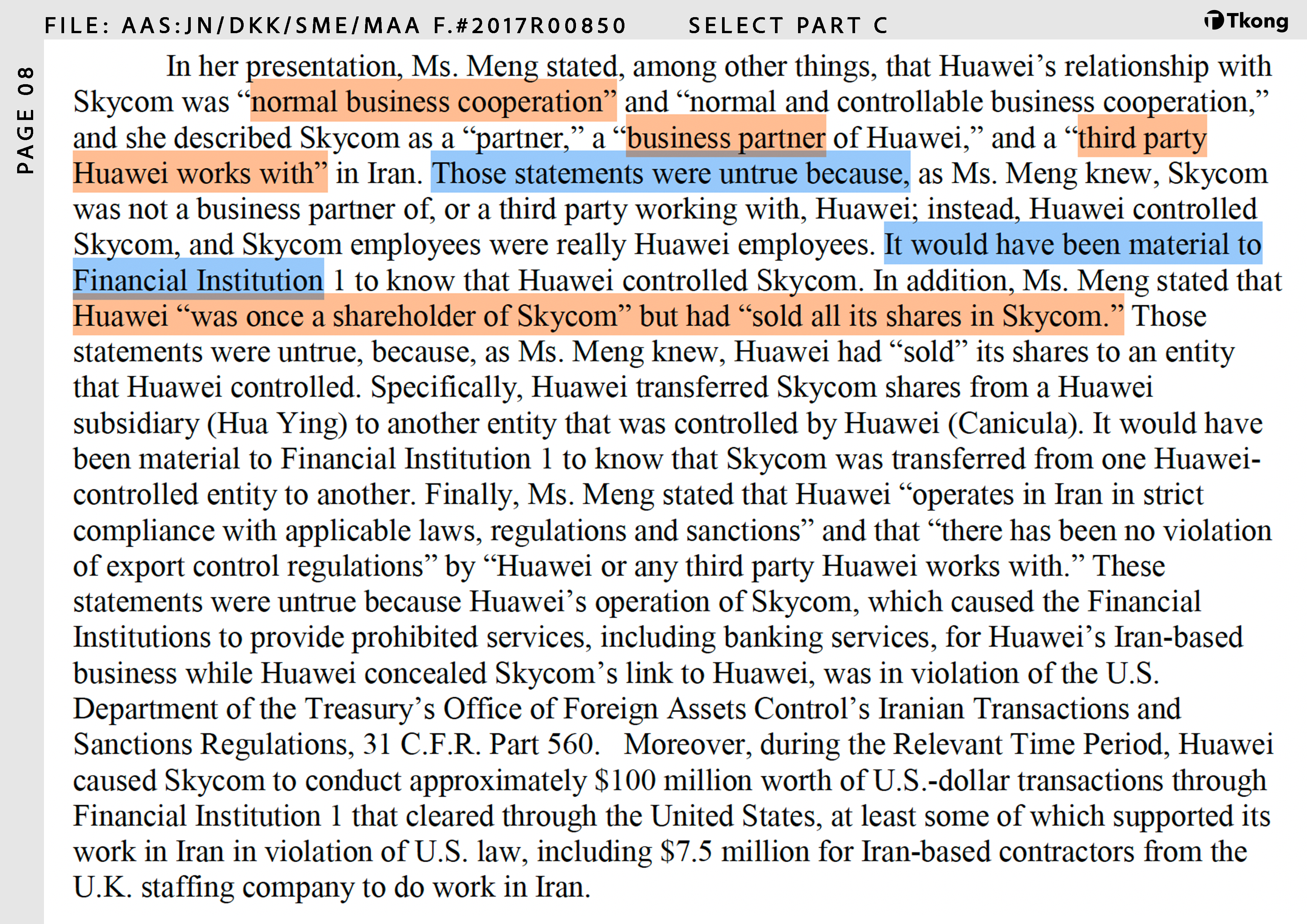 在这次关键的简报会中,孟晚舟淡化和掩盖了华为对于 Skycom 的实际控制与业务关联。这一行为影响了银行的合规与风险判断,导致银行在不知情的情况下,继续为华为可能违反美国制裁法规的伊朗业务提供美元清算服务。
