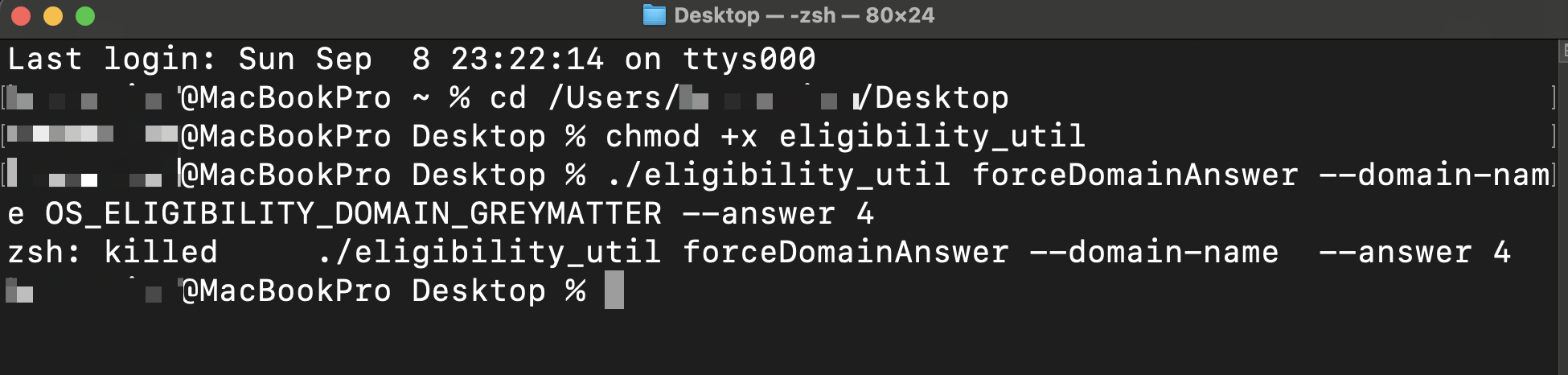 在 Terminal 终端中继续操作,首先用 cd 命令来指到 eligibility_util 所在目录(如果您不懂该方面的知识,请直接将文件放置在桌面,并直接执行 cd /Users/[你的用户名]/Desktop 命令)。接下来执行 chmod +x eligibility_util 赋予权限,再运行 ./eligibility_util forceDomainAnswer --domain-name OS_ELIGIBILITY_DOMAIN_GREYMATTER --answer 4。