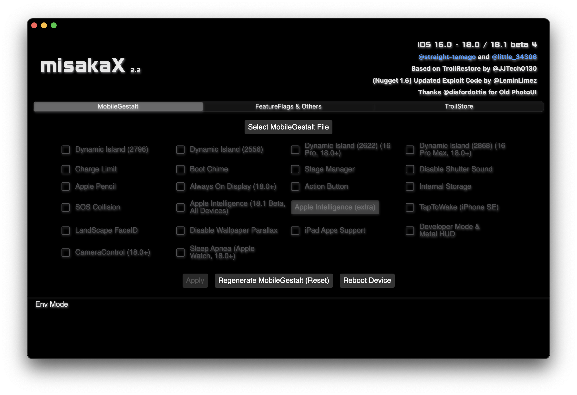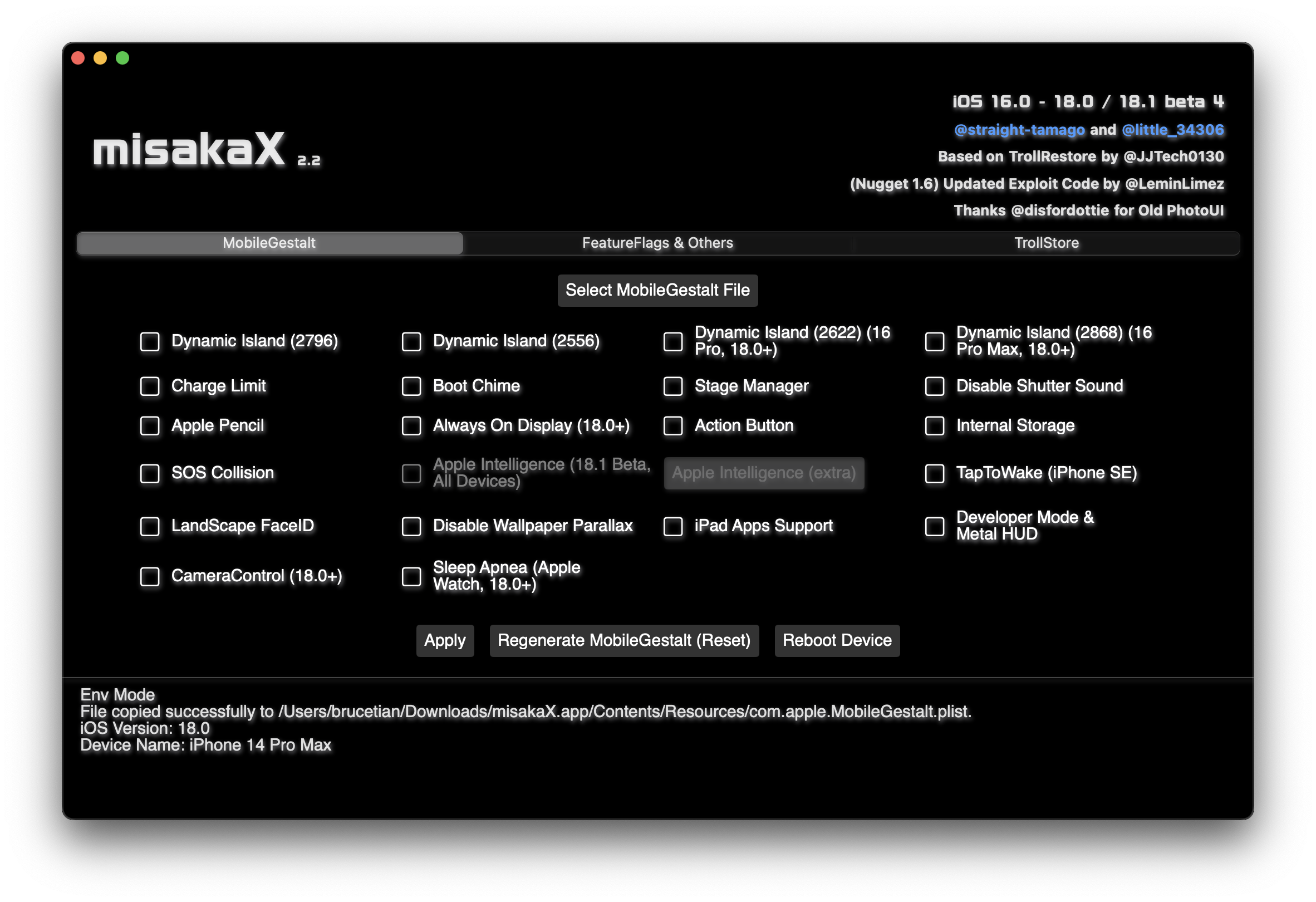 选择 Mobile Gestalt 配置档案,并于下方选择 Apple Inteligence。使用数据线缆将 iPhone 接驳至 Mac 或 Windows 后点 Apply。